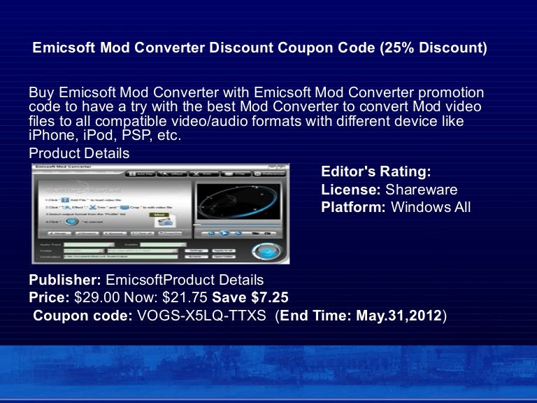 Well-known for multiple formats conversion supported and practical editing functions, Emicsoft Mod Converter for Mac provides the most perfect solution for Mac users to convert Mod files to other formats. The Mod Converter Mac supports converting Mod Mac to NDS DPG, AVI, MOV, MPEG 1/2, DivX, XviD, ASF, WMV, MPEG-4, H.264/MPEG-4 AVC, HD AVI, HD MPEG-4, HD WMV, HD VOB video, etc. With the Emicsoft M2TS Converter Mac, you can clip file length to convert certain segment of the video, crop area size to alter the playing dimension, adjust brightness, contrast and saturation to get the best output effect, merge multiple files into one, and capture good pictures from the previewing video. Emicsoft VOB Converter for Mac is compatible with all mac version (Intel, PowerPC, 10.0.x, Snow Leopard, etc). Infact this Vob Converter for Mac is not only a converter in Converting VOB files. It is a total mac video converter that can convert between many videos. Emicsoft iPhone Converter for Mac In order to help users create better video file, Emicsoft iPhone Converter for. $29 DOWNLOAD; Emicsoft DVD Ripper for Mac Want to play your favorite DVD videos on iPod Touch player? $35 DOWNLOAD Emicsoft Audio Converter for Mac Do you want to convert your audio files to other format audio files different. Emicsoft HD Video Converter is such a wonderful HD converter to meet all needs for HD video fans. With the Converter for HD video, you can convert general video to HD video, HD video to general.